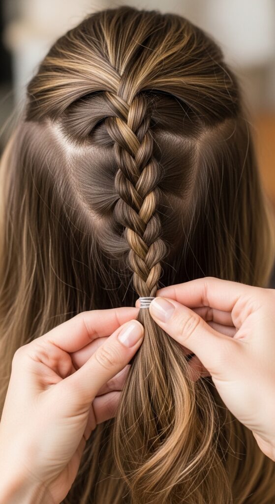 Once you stop adding hair, simply continue with a regular three-strand braid for a few more inches. Secure the end tightly with a clear elastic band. Don’t worry about how it looks yet.