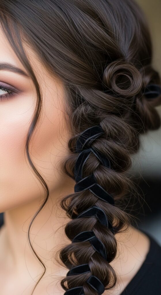 This style is a perfect base for romantic goth hairstyles. Before you start, weave a thin, black velvet ribbon or a delicate chain into the sections of your hair. Braid it right in.