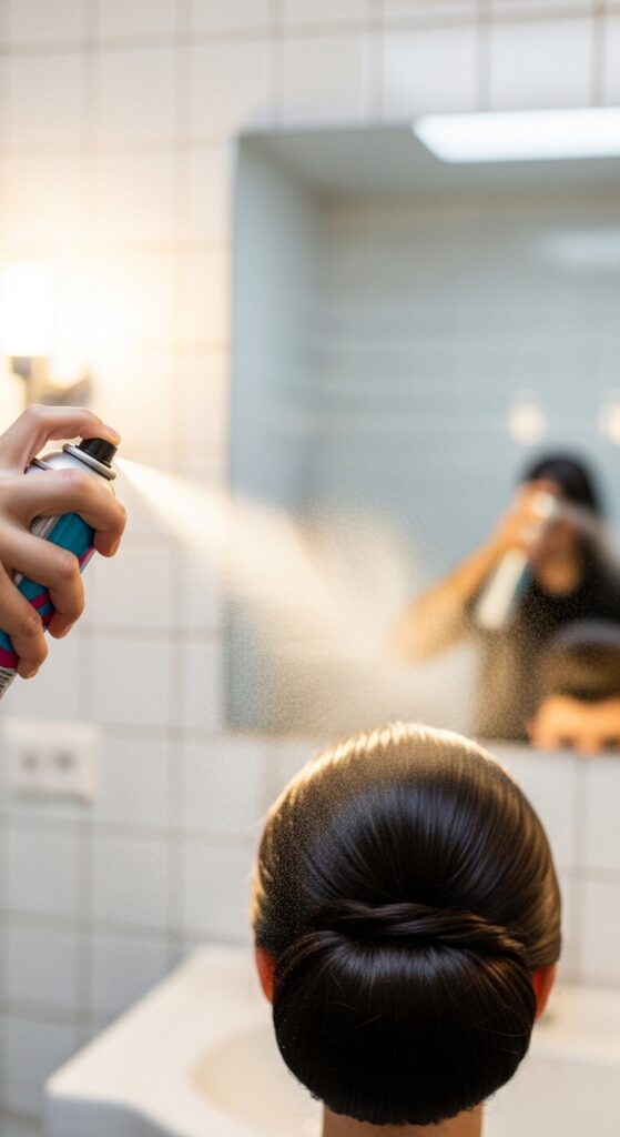 Lightly mist your entire head with a flexible-hold hairspray from about 12 inches away. This sets the style without making it stiff. If you have any wispy baby hairs, you can use a tiny bit of gel on a toothbrush to smooth them.