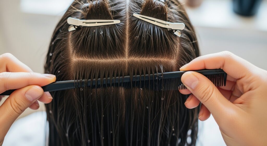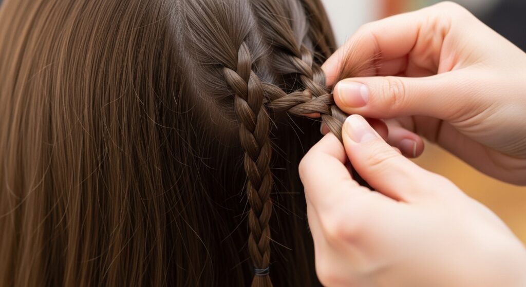 The width of each braid section should be even. I use the comb’s teeth as a guide. Mark this section with the comb before you even pick up hair to braid. Precision here saves time later.