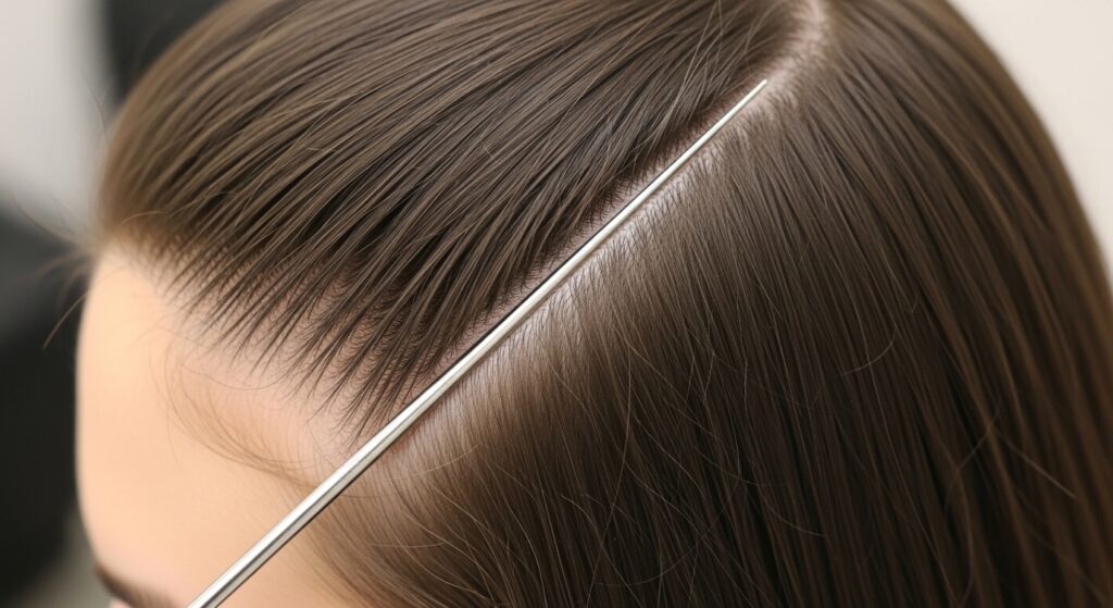 Take your first bottom section. Using the tail of your comb, map out a diagonal line from the nape of your neck up towards your temple. This will be the path your first ladder climbs.