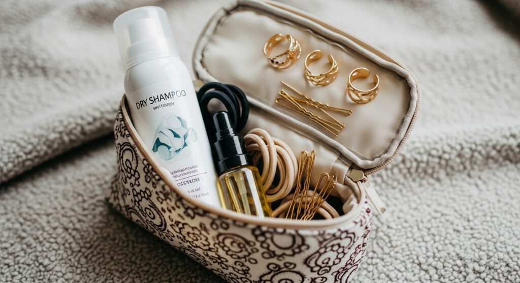 Keep it simple. You don’t need a full salon. Pack a travel-sized dry shampoo for your roots if needed, a tiny bottle of hair oil for flyaways, and extra elastics that match your hair color.