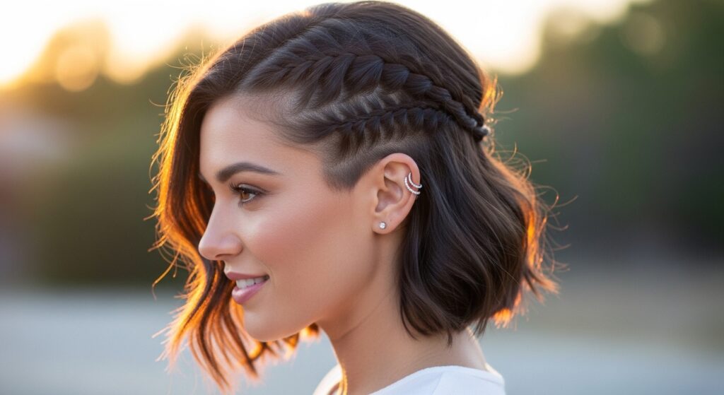 This keeps the hair out of your face while letting the rest flow. It’s a gorgeous look for those with an asymmetrical lob or shorter cuts, adding detail to the shorter side.