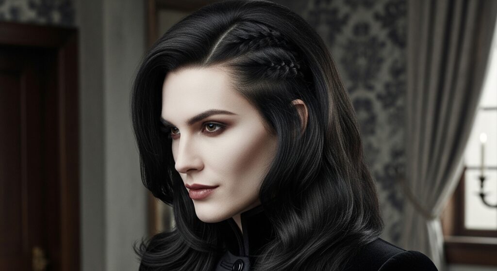 The vampire haircut is all about sharp, dramatic layers. Use braids to highlight this texture. Braid a section from the shorter top layers back into the longer hair.