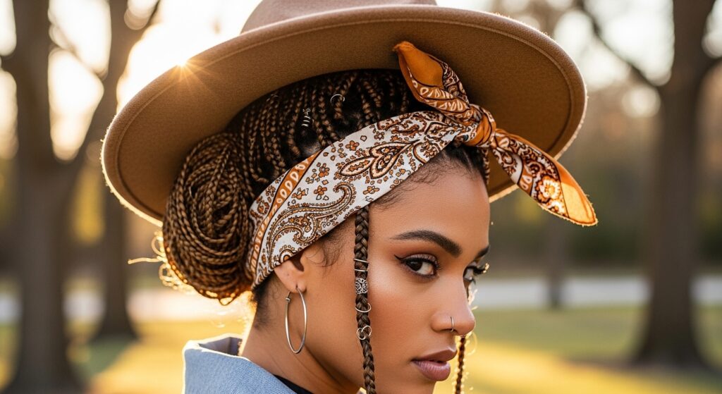 Double up on protection and style. A bandana tied over your braids looks cool and keeps dust off your actual hair. Wide-brimmed hats are also your friend.
