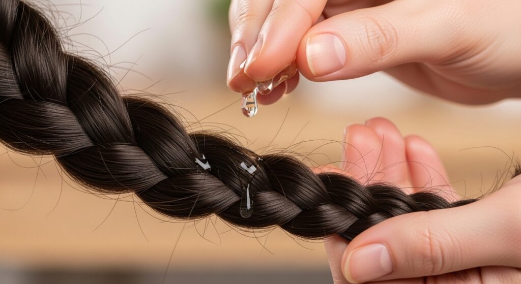 Braided hair still needs moisture. Mix water with a little leave-in conditioner in a small spray bottle. Give your braids a light mist each evening, focusing on the ends.