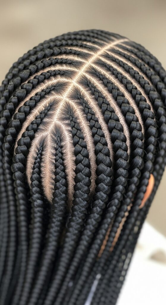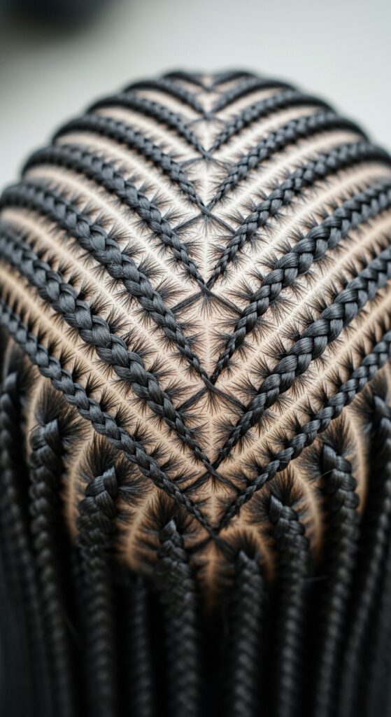 It’s a universally flattering pattern that feels modern and sleek. The braids follow these diagonal paths, making the style look longer and fluid. It’s elegant in its simplicity.