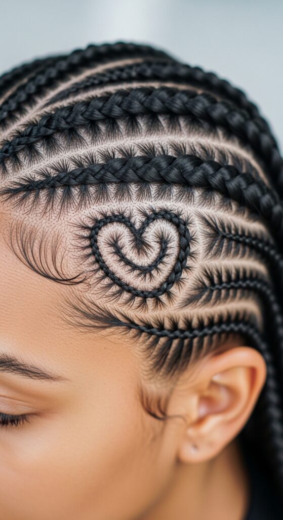 Incorporate a cute, personal detail with hidden or bold heart shapes. This map might place a small heart design near the temple or use partings to form a larger heart at the back of the head.