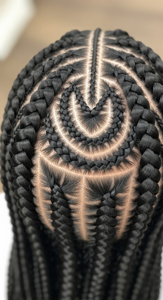 This is pure artistry. Starting from a central point at your crown, the cornrows swirl outward like a beautiful sunburst or galaxy. It’s a radiant pattern that draws the eye upward.