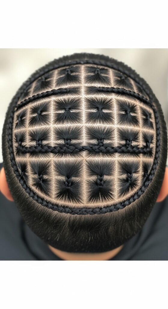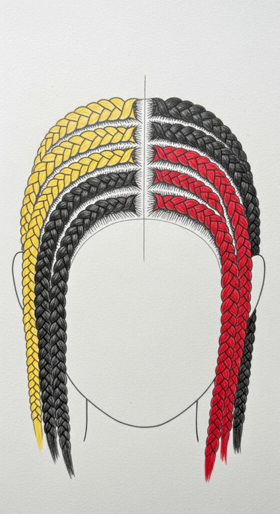This advanced map plays with braid thickness. Plan sections where groups of thin cornrows alternate with a few thicker ones. When braided, this creates a textured, basket-woven illusion that’s rich with depth.
