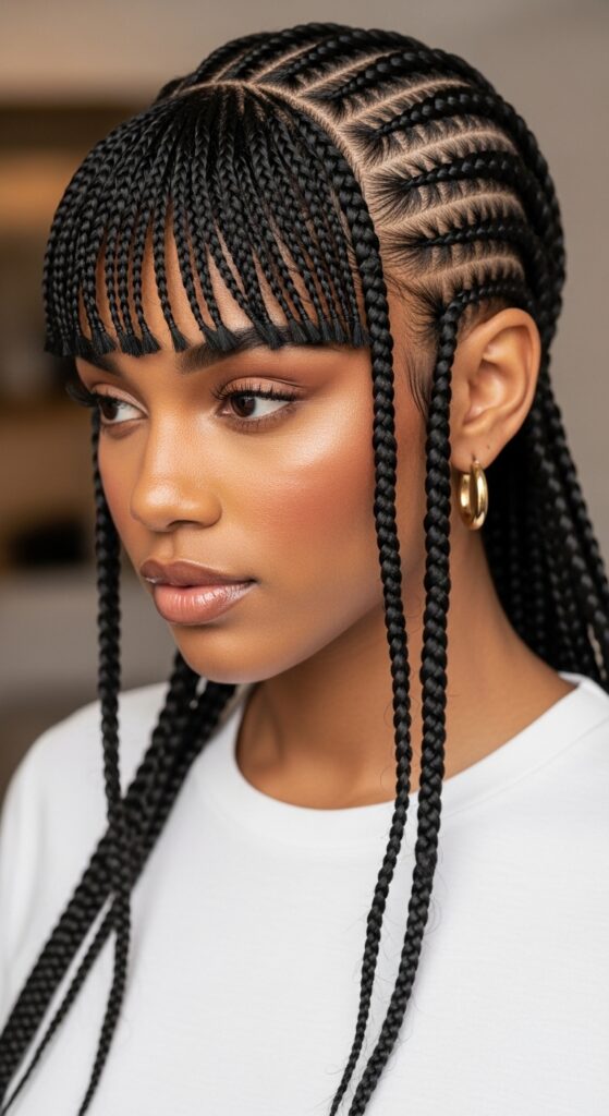 The rest of the hair can be styled in simpler, straight-back cornrows, letting those front “bangs” truly pop. It’s a beautiful fusion of cultural braiding techniques and a striking Japanese-inspired shape.
