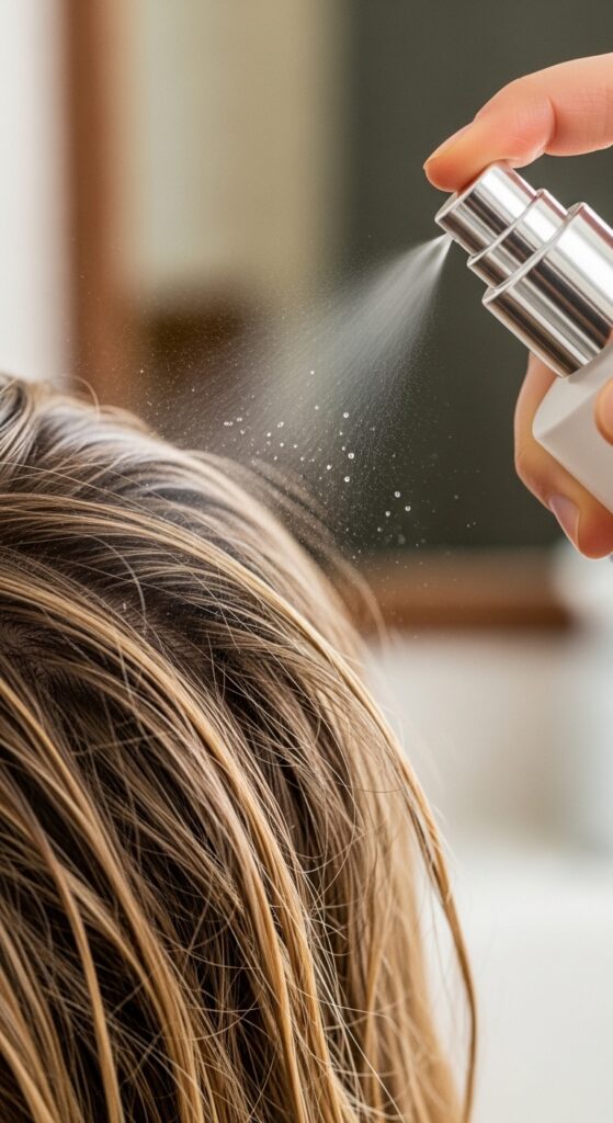 - Spray on damp, towel-dried hair.