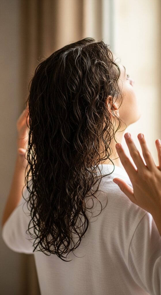 This technique evenly distributes product and smoothes the hair cuticle. Follow it up with scrunching to encourage your curl pattern. It’s a simple way to get a more polished, frizz-free finish.