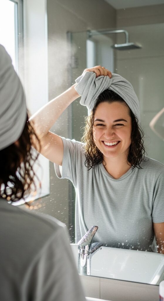 It’s super simple and makes a huge difference. After applying your product, flip your hair over onto the center of the shirt, wrap it up, and let it sit for 15-20 minutes. You’ll get much more defined, clumped-together waves.