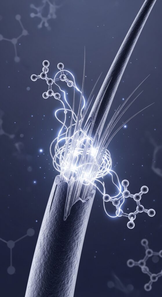 Recycled silk protein works with your hair, not against it. Instead of coating strands in a plastic shell, the smaller silk molecules are able to penetrate the hair cortex slightly. They fill in gaps and patch up damage from the inside out.