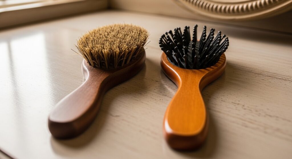 Boar bristle brushes are often set in a wooden or bamboo handle, avoiding plastic entirely. They are excellent for smoothing hair before creating sleek styles, like an asymmetrical lob or an old money hair look that demands polish.