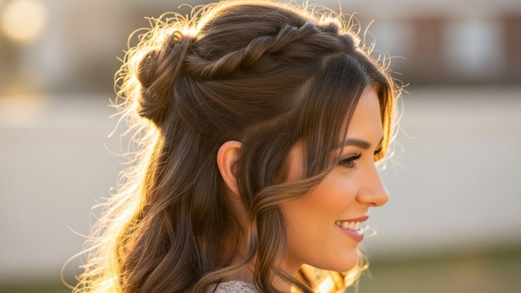 The half-up hairstyle gets a major elevation with a simple twist. Instead of just grabbing the top section with a clip, take two small sections of hair from your temples. Twist them gently backwards, meeting them at the back of your crown. Secure them together with a tiny, clear elastic or a beautiful mini-clip.