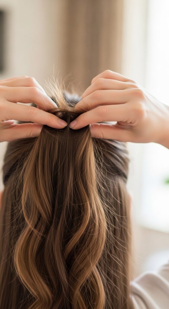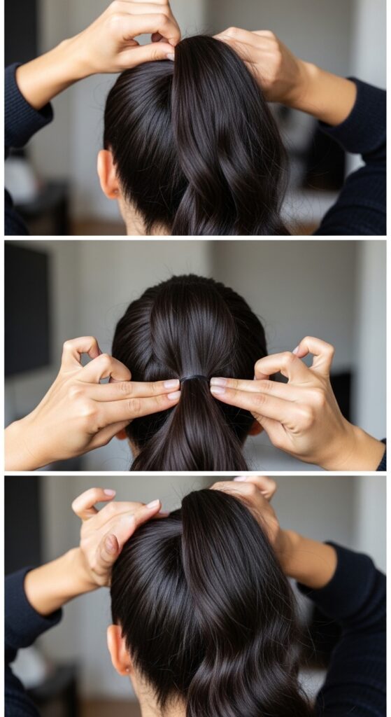 This lifts the roots as you secure. Then, put the tie on its first loop. On the second loop, pull the hair through only halfway to create a loop. This adds bulk and height at the base instantly.