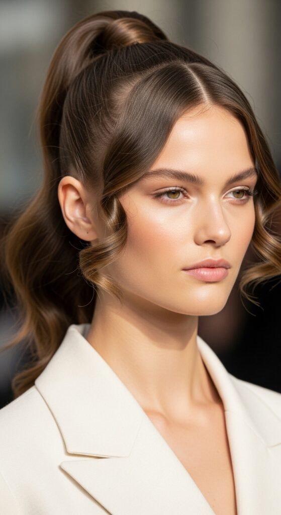Then, lightly smooth over the top layer to hide the teased section. When you pull your ponytail over this “cushion,” it creates a natural, lasting lift. This technique is a secret behind many old money hair looks—polished from the front, secretly voluminous on top.