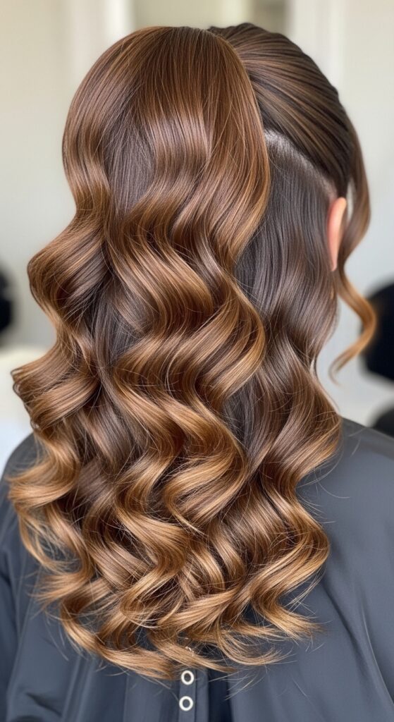 Shake the curls out with your fingers and mist lightly with hairspray. This adds width, bounce, and a touch of romantic goth hairstyles drama, making the entire style look thicker and more luxurious.