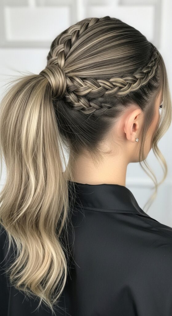 After a few stitches, gather the braid and the rest of your hair into the high pony. This adds texture, detail, and an edgy feel that’s perfect for updating your look.