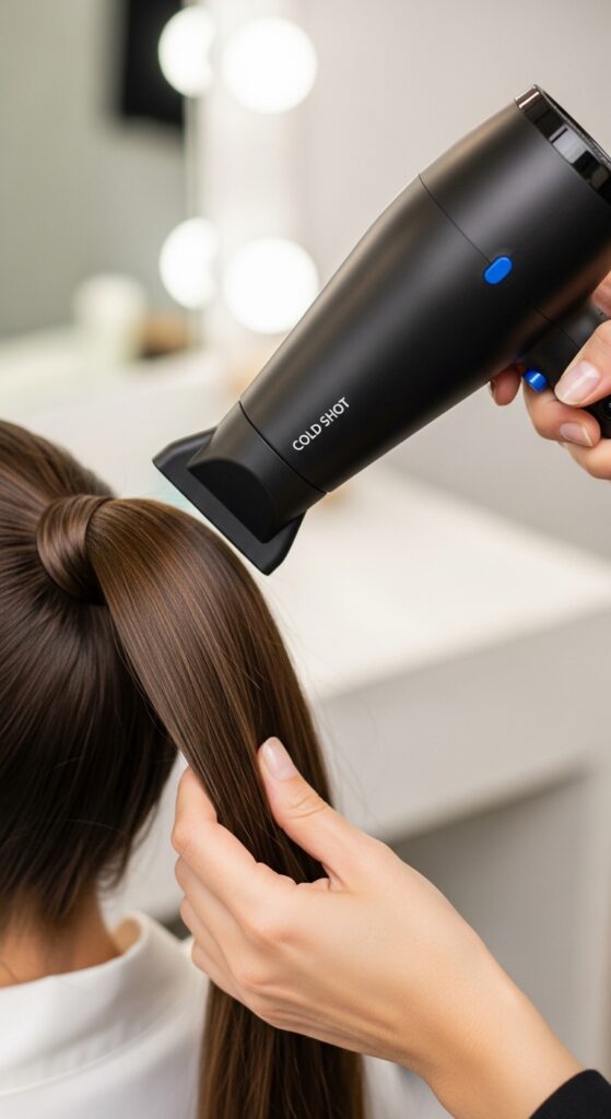 This cools the hair shaft, locking the style in place. It’s a pro trick that makes your volume last hours longer. It’s the perfect finishing touch.