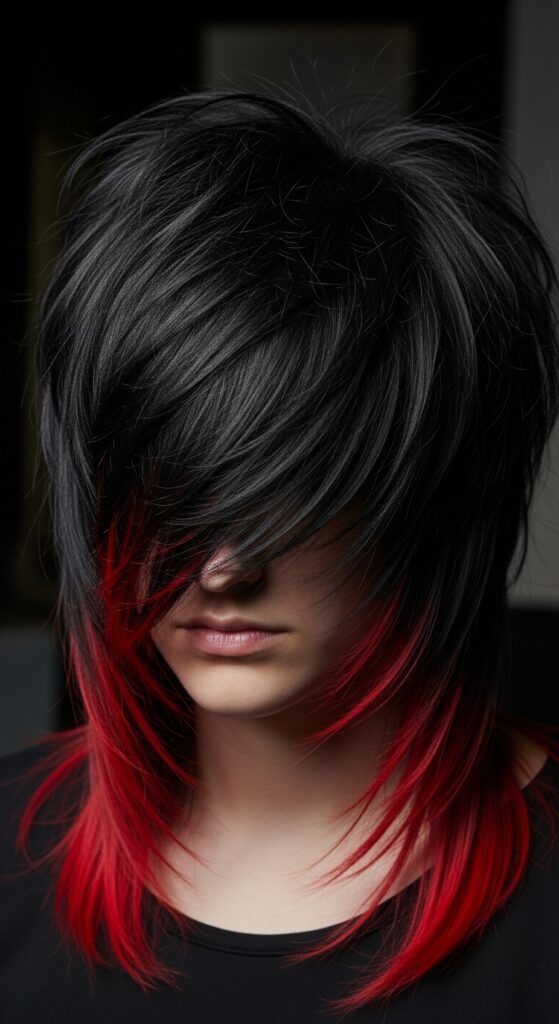 The vampire haircut—all shaggy layers and dramatic texture—is begging for color. Instead of all-over black, think about adding pops at the tips or in the underlayers. Deep reds, violets, or even a shock of white can look incredible.