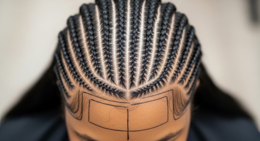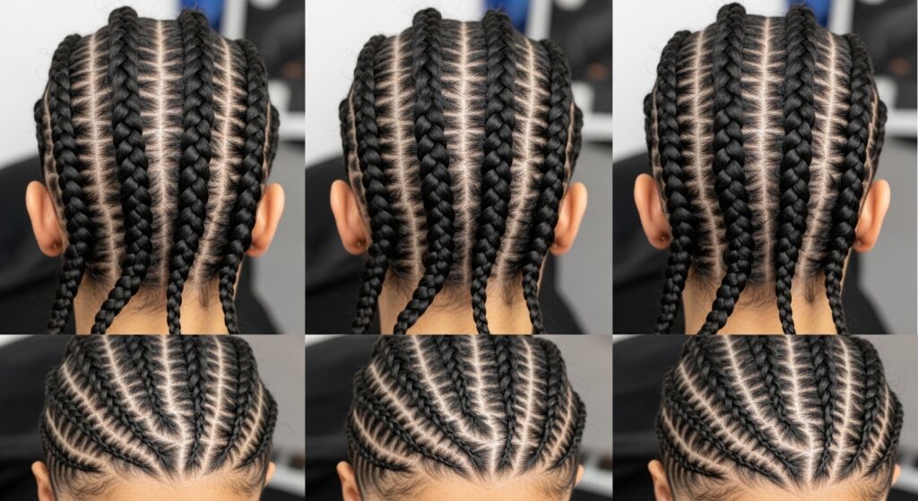 Before you start, decide on your pattern. For the classic look, you’ll create multiple braids that start at the nape of your neck and climb upwards. Use the end of your comb to draw clean, straight part lines.