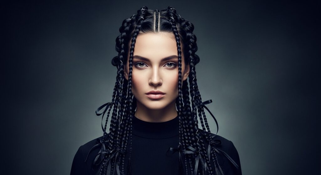 This style can easily lean into romantic goth hairstyles. Start with deep, dark hair or add temporary color spray. Weave in tiny, delicate black ribbons or silver charms into the braids as you go.