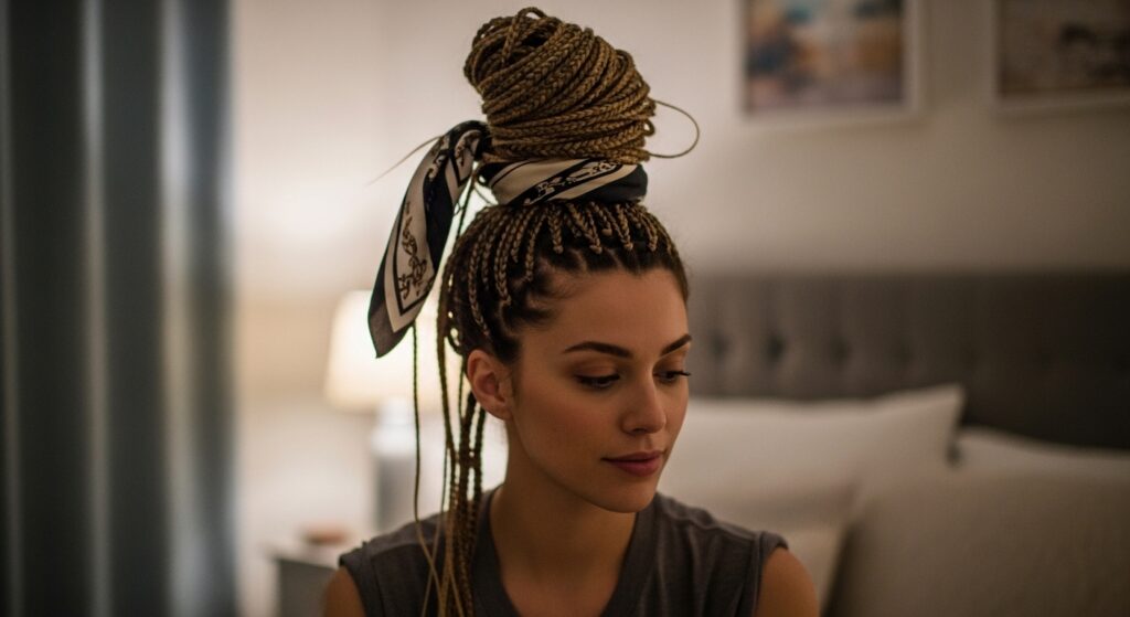 Want to save your masterpiece for a second day? Sleep on a silk or satin pillowcase to reduce friction. You can also loosely gather all the braids into a very high, loose ponytail on top of your head (a “pineapple”) before bed.