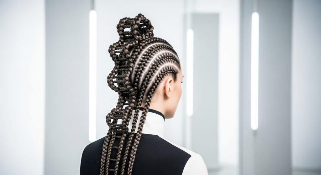 For a futuristic twist, incorporate the glitchy glam hair trend. Use small, colored hair wires or metallic threads in neon or silver. Weave them into a few select braids, letting them peek out of the ladder gaps.