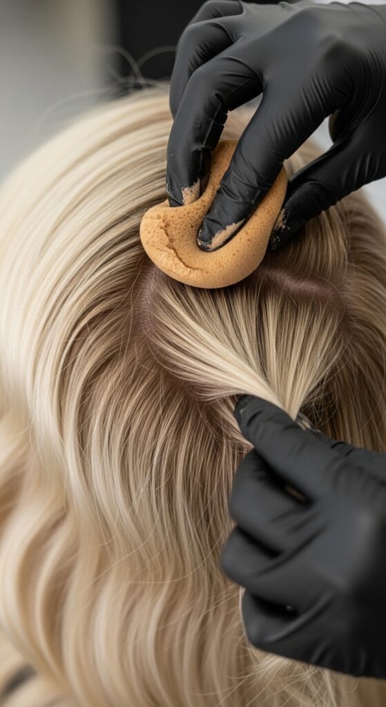 If you love that soft, shadow-root, or balayage look, a sponge can help you fake it. You can use it to lightly blend a darker shade at your roots or to softly smudge a lighter tone down your strands.