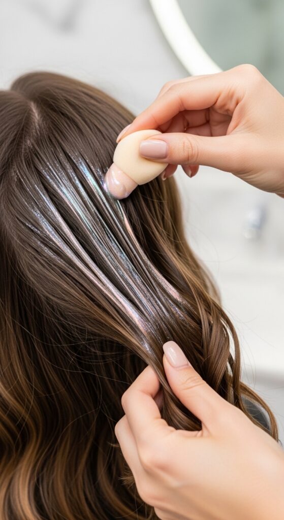 The sponge distributes the thin, often runny formula perfectly. It helps you coat every strand evenly, which is the secret to that all-over shine and consistent tone, whether you’re maintaining an old money hair gloss or a vibrant fashion color.