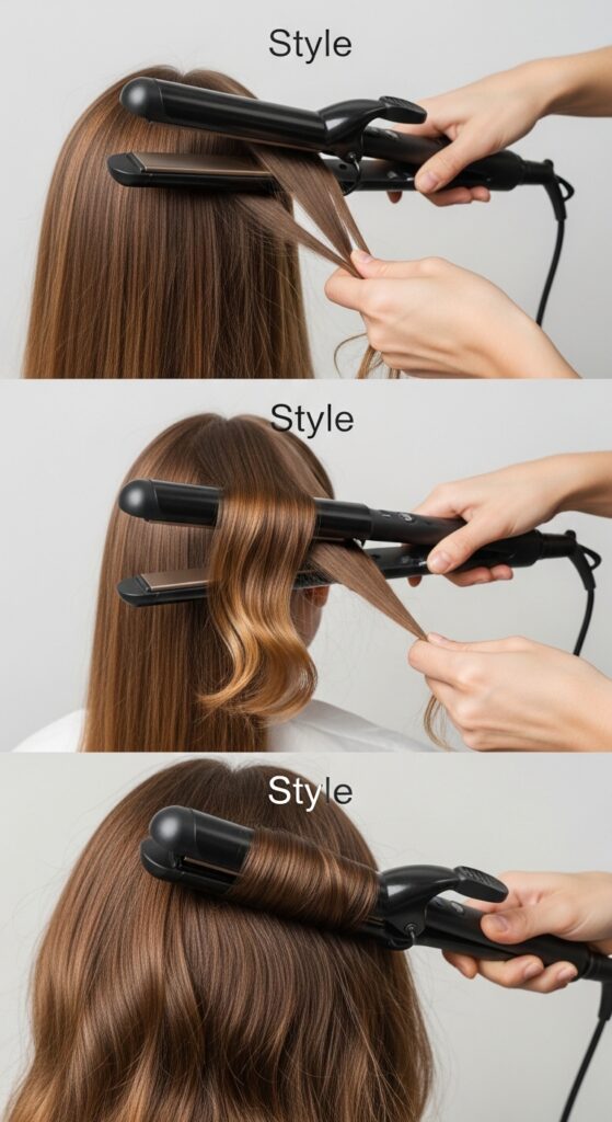 - Apply a leave-in conditioner and heat protectant to damp hair.