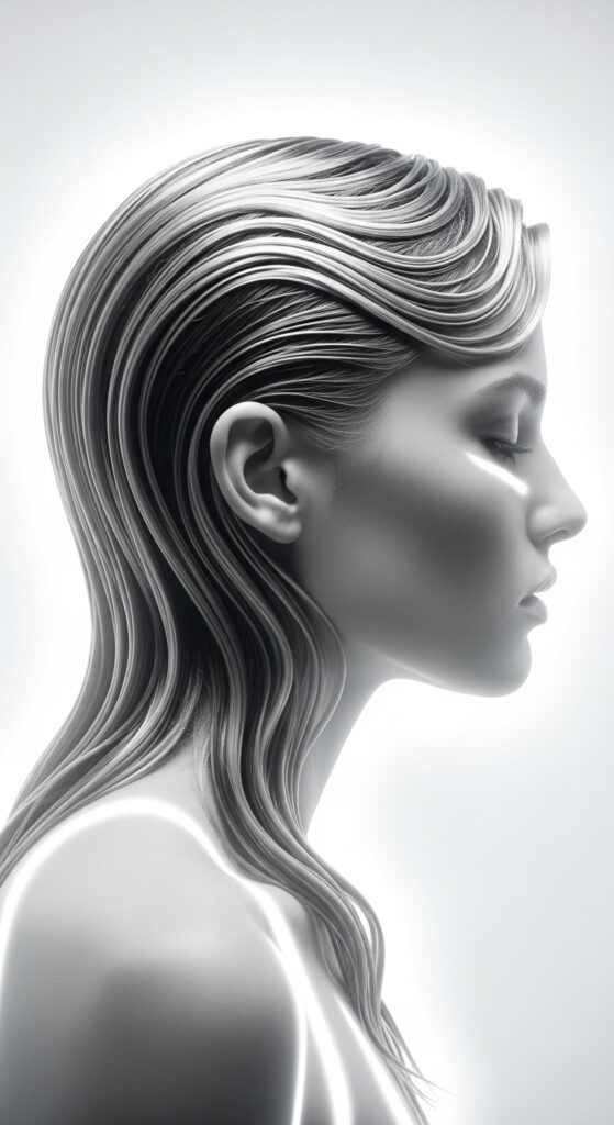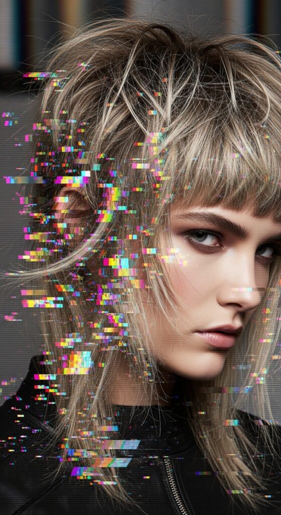 Glitchy glam hair embraces intentional imperfection, but it still requires technique. The goal isn’t stark sleekness, but a soft, blended haze around the face.