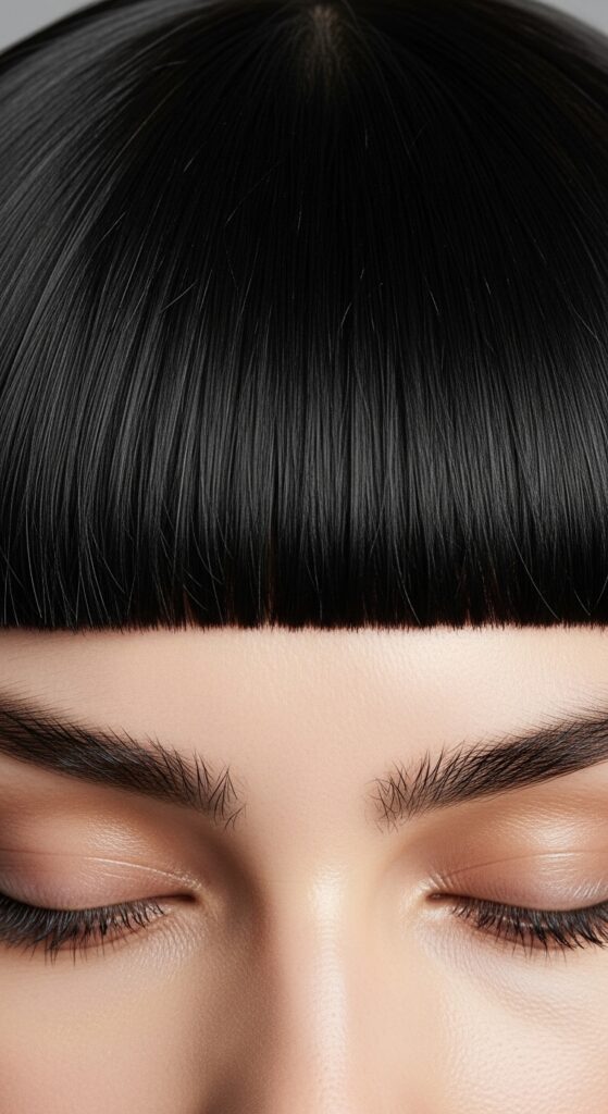 Hime cut bangs need to lie perfectly flat. After straightening, use the sponge tip to apply a minuscule amount of serum or light gel just at the very top of the bang line, under the hair.