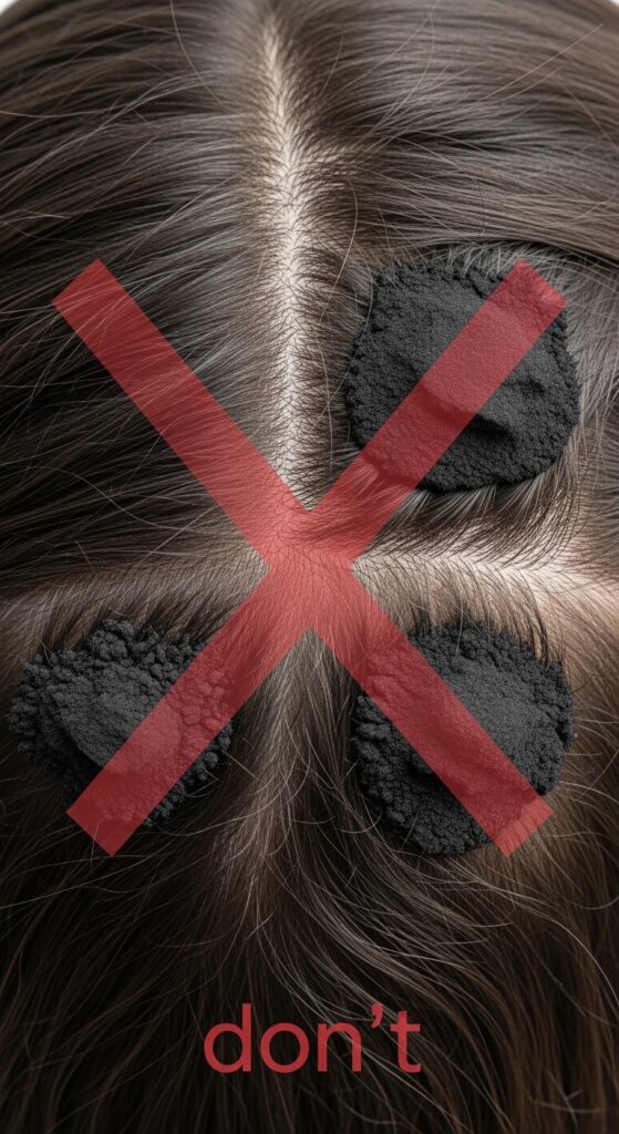 Don’t use too much powder—a little goes a long way. Overdoing it can be drying. Don’t scrub too hard; be gentle. Your scalp is sensitive.
