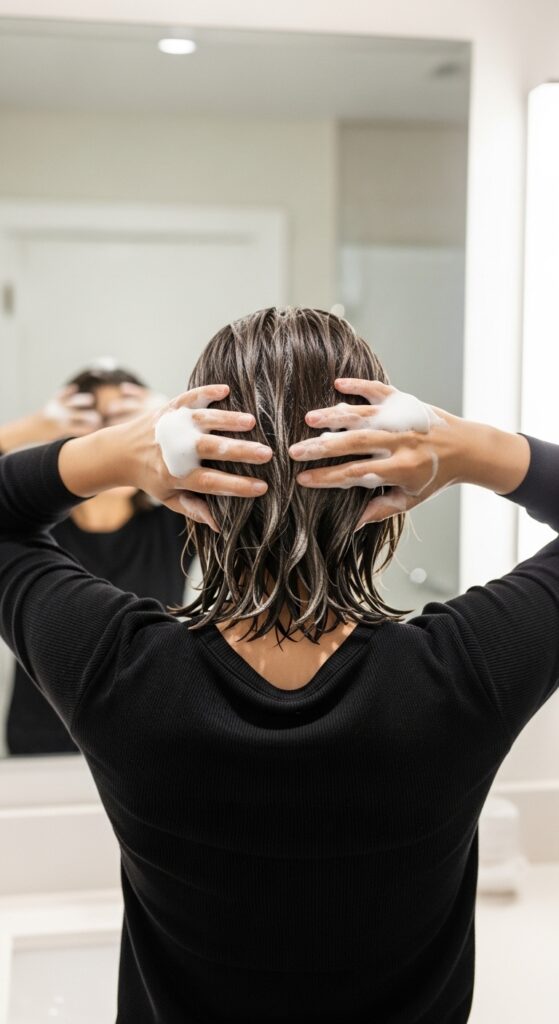 Lift sections and mist the foam directly at your roots, then massage. This gives instant lift that lasts. Avoid applying too much to the ends to prevent weighing hair down.