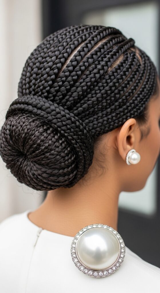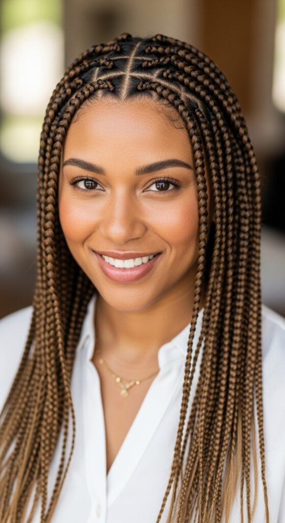 For a softer take on quiet luxury, longer feed-in braids in a natural brown shade, styled in a simple, low ponytail with a silk scarf, look incredibly elegant and understated. It’s all about the polished finish.