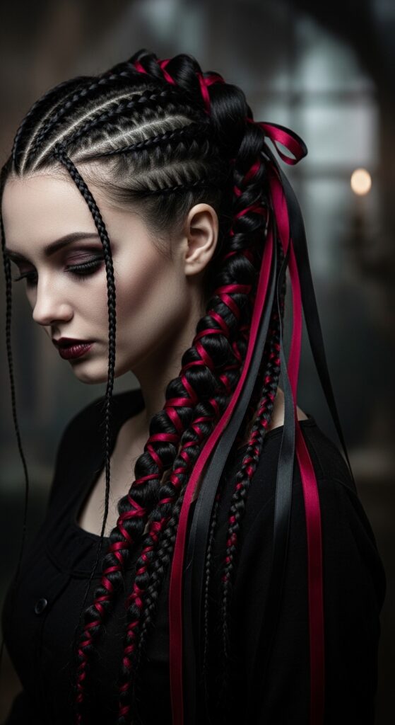 For romantic goth hairstyles or that vampire haircut edge, braids are perfect. Add ribbons, charms, or leather cords to your braids. Feed-in styles with face-framing pieces can be twisted into dramatic, soft tendrils.