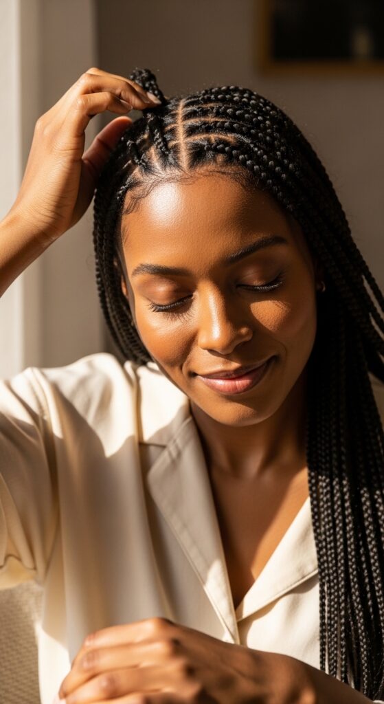 Box braids, with their defined parts and knotted base, often keep a neater, frizz-free look at the roots for a longer period. The structure contains the new growth more distinctly. Using a light edge control or gel can help both styles, but box braids have a slight edge here.