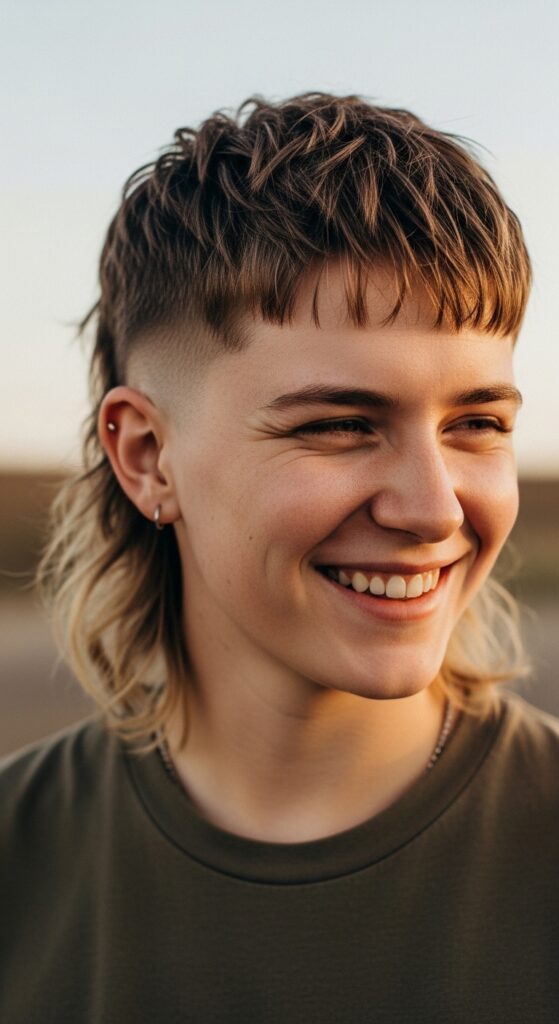 The mullet is back, but think softer and more wearable. The textured mullet crop keeps the sides short but leaves enough length at the crown and back to create choppy, movable layers.