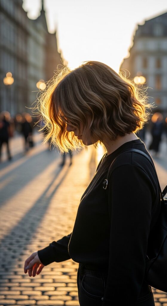 An asymmetrical lob is a genius way to have “short” hair with a dramatic edge. One side is significantly longer than the other, creating a striking diagonal line. The texture keeps it modern, not dated.