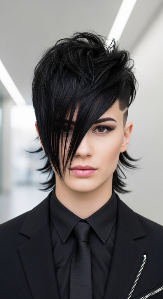 Add choppy ends and internal layers for movement. You can style it sleek or messy, but that strong diagonal line will always be the star. It’s a sophisticated take on an edgy cut.
