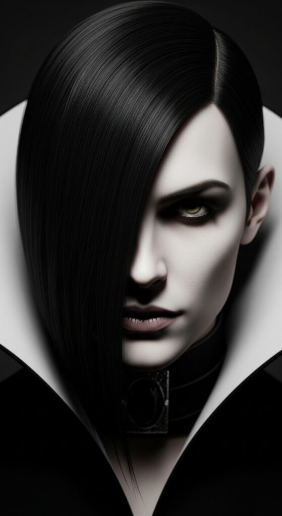 The vampire haircut is sleek, sharp, and a little bit dangerous. For short hair, it often features a severe, deep side part and one longer piece that can sweep across the forehead or cheek.