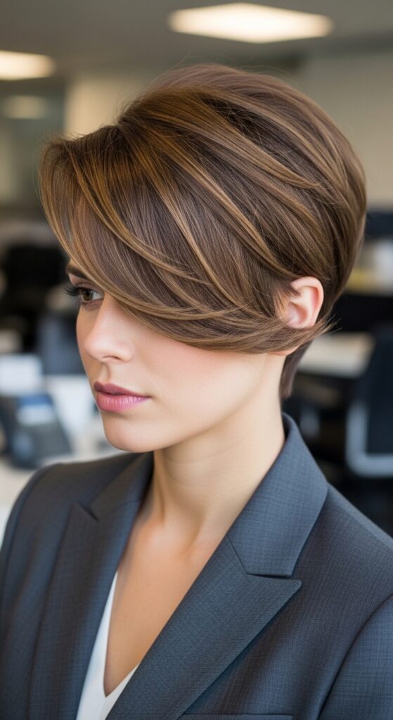 This is a polished yet edgy option. It involves cutting your crop with a deep side part and leaving enough length on top to sweep across your forehead. The texture prevents it from looking too stiff.