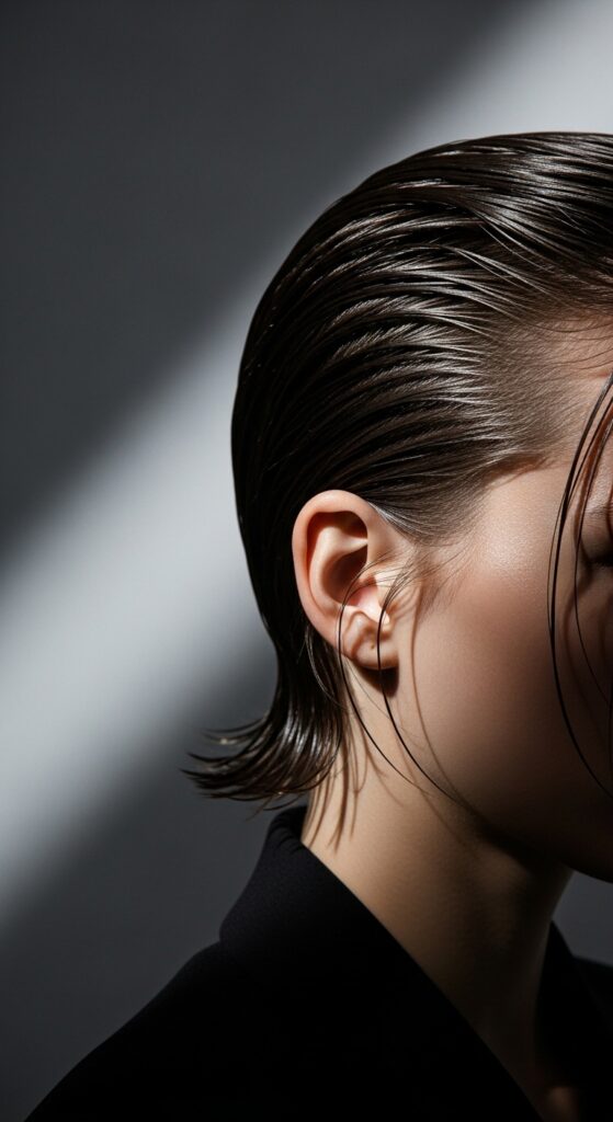 The wet look is a major trend that works amazingly on short hair. It gives texture a sleek, glossy, and intentional finish. It’s edgy because it’s so bold and polished.