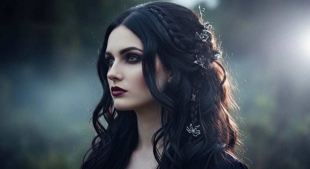 For romantic goth hairstyles, the look is soft, mystical, and textured—not frizzy. The Curl-Defining Serum or a light glossing product works well. It defines the romantic waves or curls while keeping a touch of ethereal softness, not crunchy hold.