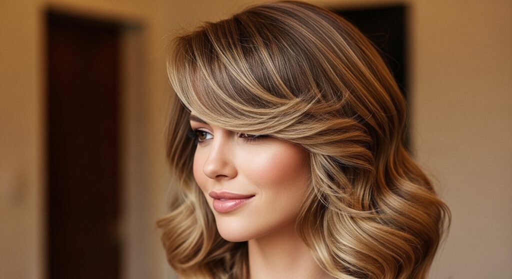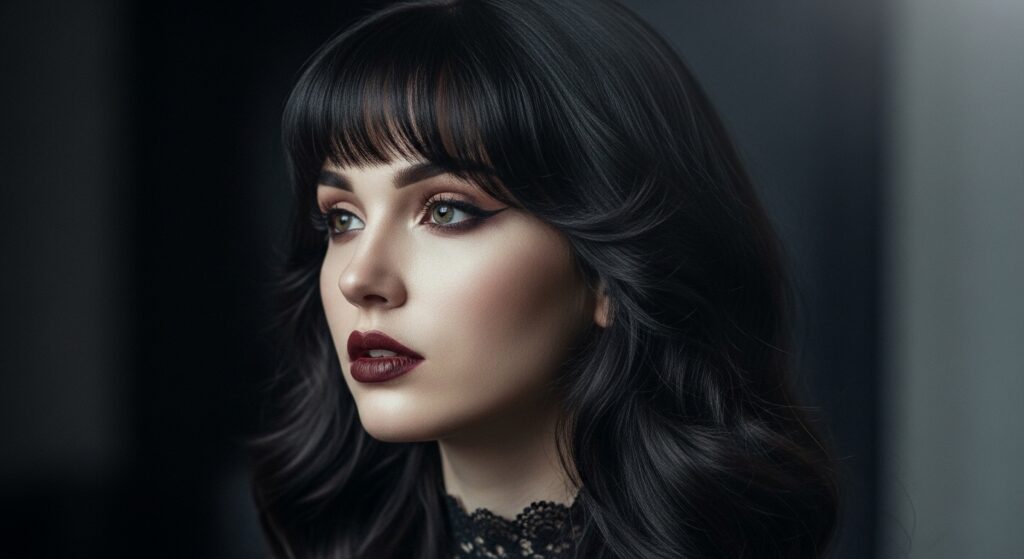 The bangs soften the forehead, while the waves add width around the jaw, creating a dreamy, balanced effect. It’s soft and dramatic all at once.