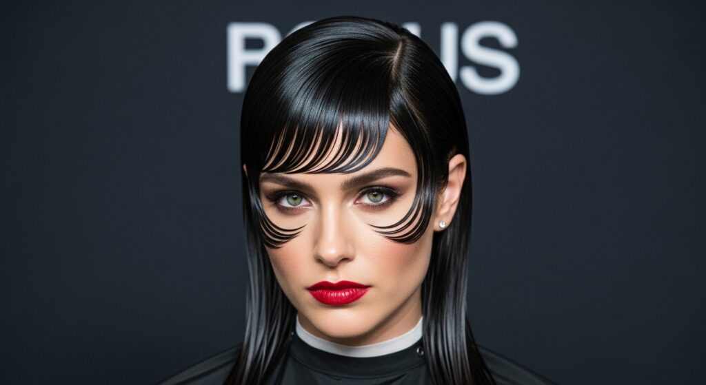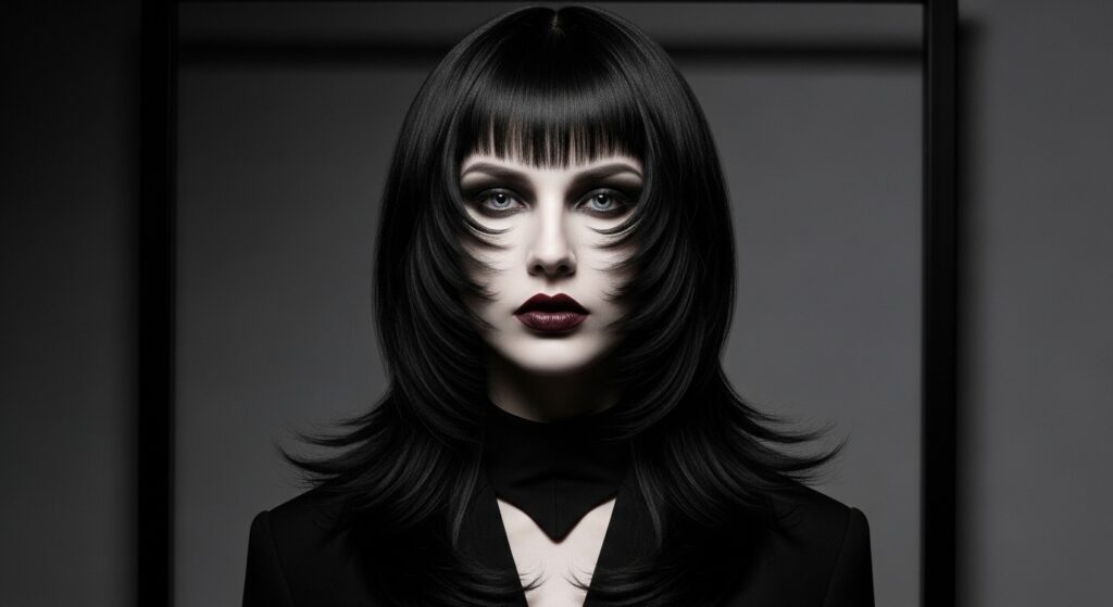 The vampire haircut isn’t just a trend; it’s a mood. For us, it means longer, sharp layers with a very defined curtain bang.